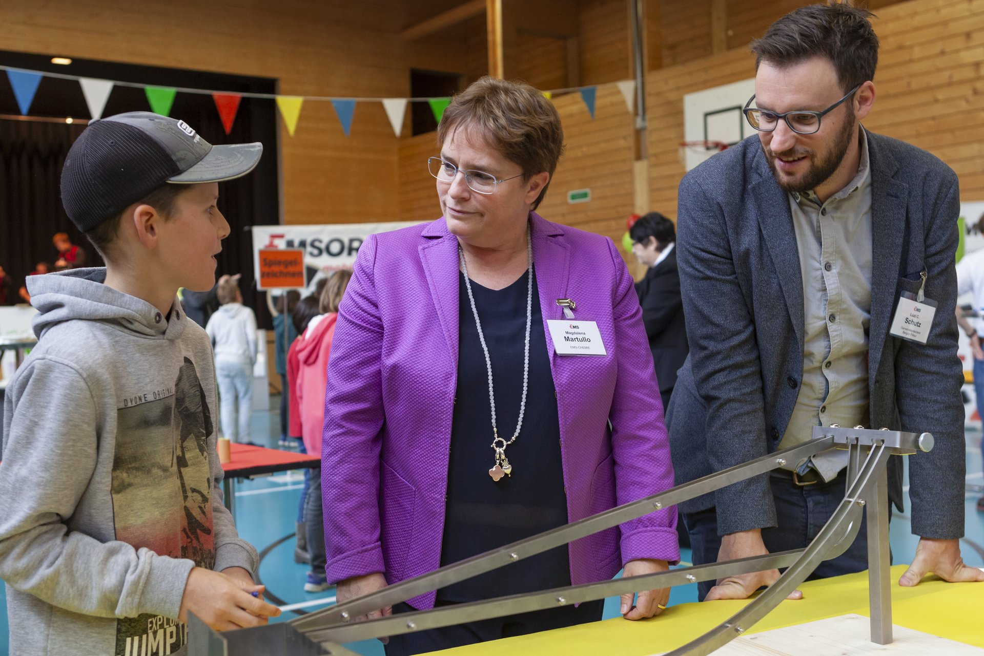 Im Beisein von Vertretern des Gemeindevorstands, des Gewerbes, der Schule und zweier Primarschulklassen von Bergün – musikalisch umrahmt durch die Musikgesellschaft Bergün – eröffnete die Chefin der EMS-CHEMIE, Magdalena Martullo, gemeinsam mit Gemeindepräsident Luzi C. Schutz und Schulratspräsident Reto Bachmann stolz das erste mobile Bündner Science Center EMSORAMA Mobil. Sie hätte schon länger die Idee gehabt, das EMSORAMA auch in die Dörfer und Täler zu bringen und Gross und Klein die faszinierenden Phänomene aus Natur und Technik erleben zu lassen.