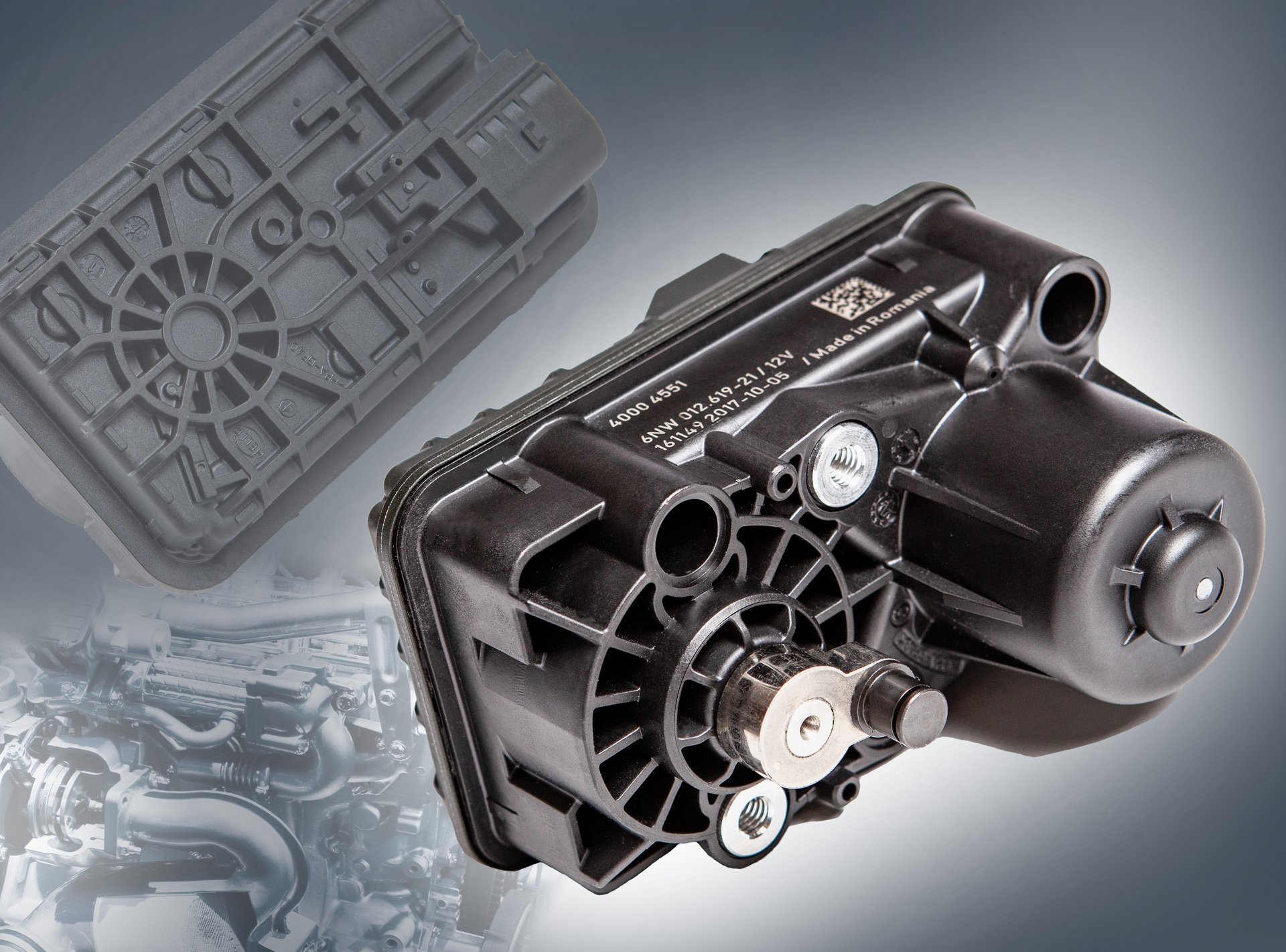 Das zweite Bauteil war ein universeller Turboaktuator der Firma Hella aus Grivory HTV. Mit dieser Vollkunststofflösung wurde die zweite Generation von Turboaktuatoren für die Ansteuerung der variablen Turbinengeometrie entwickelt, mit der gegenüber der ersten Generation Gewicht und Montagekosten eingespart werden. Durch die hohe Wärmeformbeständigkeit von 280 °C (HDT/A) liefert Grivory HTV die Grundlage für die geforderten hohen Steifigkeiten und Festigkeiten. Das robuste Kunststoffbauteil erlaubt gegenüber der ersten Generation sogar 35 °C höhere Einsatztemperaturen und die Übertragung noch grösserer Drehmomente, was motorseitig höhere Betriebstemperaturen und Ladedrücke ermöglicht. Die beiden Schalen des Aktuators werden laserverschweisst, wofür eine spezielle Farbeinstellung entwickelt wurde. Im sichtbaren Licht erscheint diese Farbe schwarz, im relevanten Wellenbereich von 700 – 1100 nm beim Laserschweissen ist sie jedoch transparent.