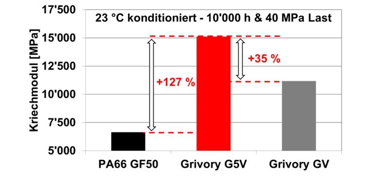 Die neuste Produktentwicklung von EMS für den Metallersatz ist neben Grivory HT6 Grivory G5V. Beide Produkte erweitern den Einsatzbereich von Polyamiden hin zu höheren Temperaturen und ermöglichen eine kosteneffiziente Herstellung von Leichtbauteilen, die bis vor Kurzem nur mit metallischen Werkstoffen realisiert werden konnten. Die verbesserte Kriechbeständigkeit beider Produkte ermöglicht geringere Wandstärken und spart dadurch Gewicht und Kosten auch gegenüber anderen Metallersatzlösungen.
