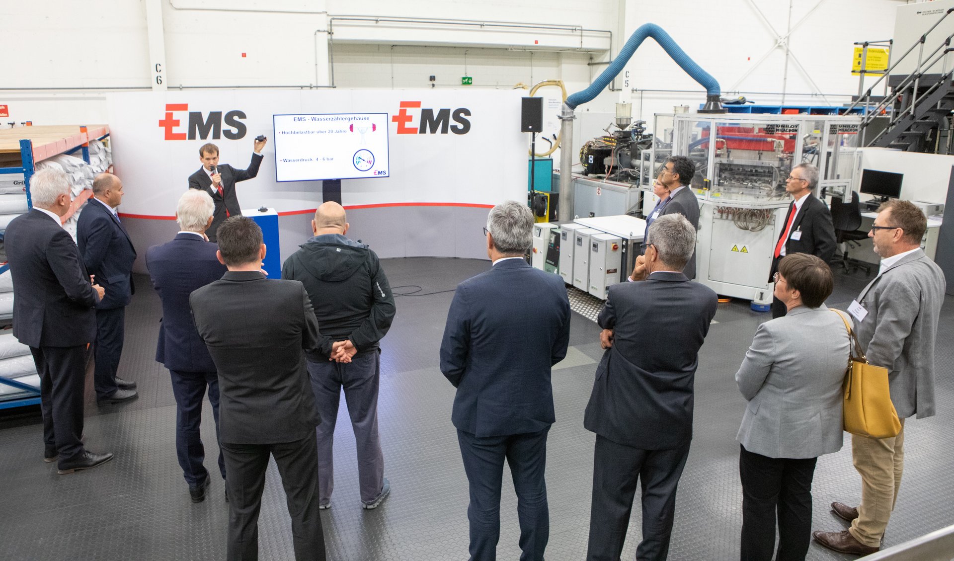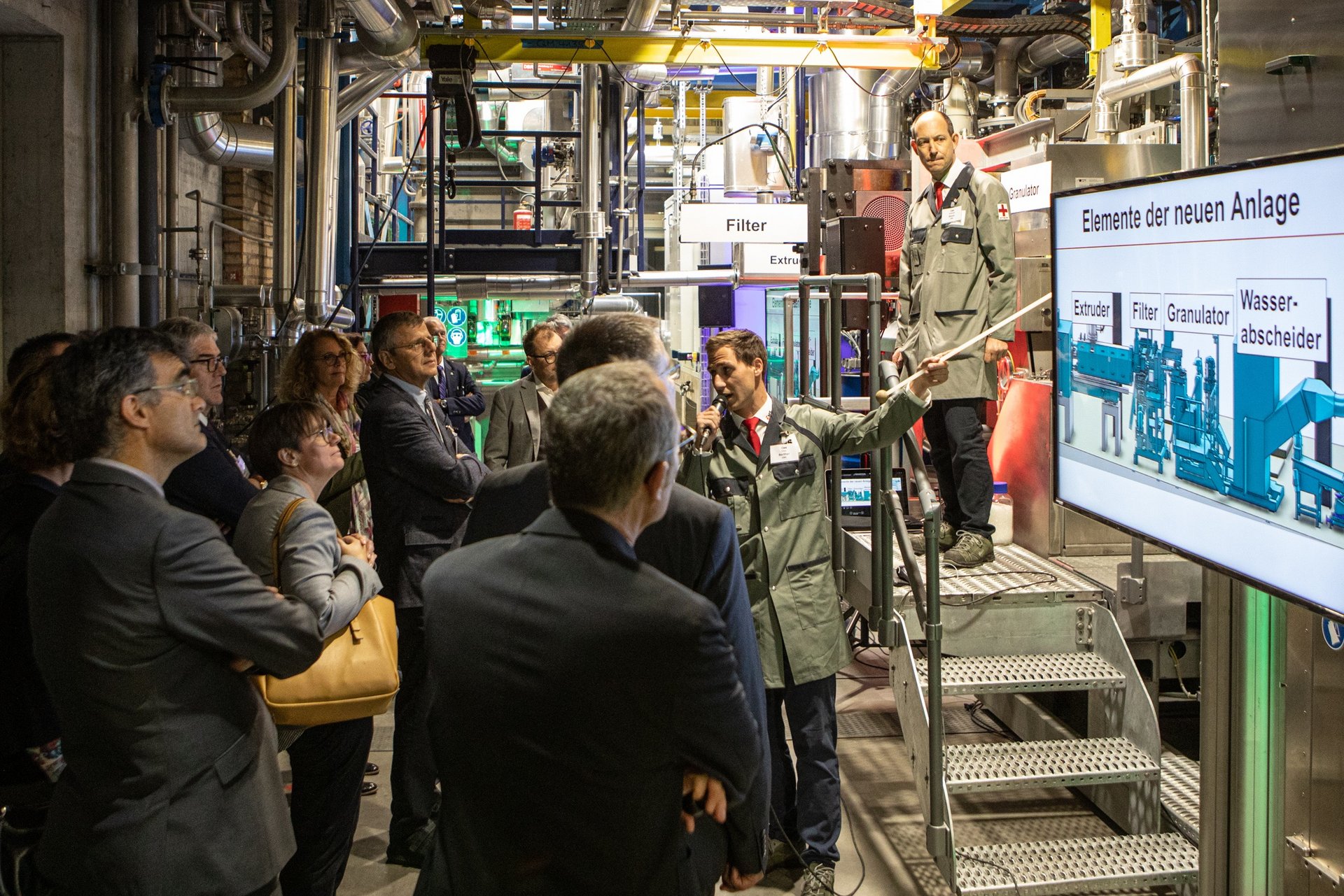 Auf dem anschliessenden Rundgang durchs EMS-Werk konnten die Bündner Parlamentarier und Regierungsmitglieder gleich vor Ort die Innovationen des CO2-negativen Standorts besichtigen. Eine Revolution ist die allerneuste, von EMS selber entwickelte Produktionsanlage. Sie braucht nur noch die Hälfte an Energie und ein Drittel weniger Platz als ihre Vorgänger, vermag pro Jahr aber die dreifache Menge an Spezialkunststoffen herzustellen. Damit aber nicht genug: Bis 2025 werden zwei weitere der besonders energiesparenden Produktionsanlagen in Betrieb gehen.