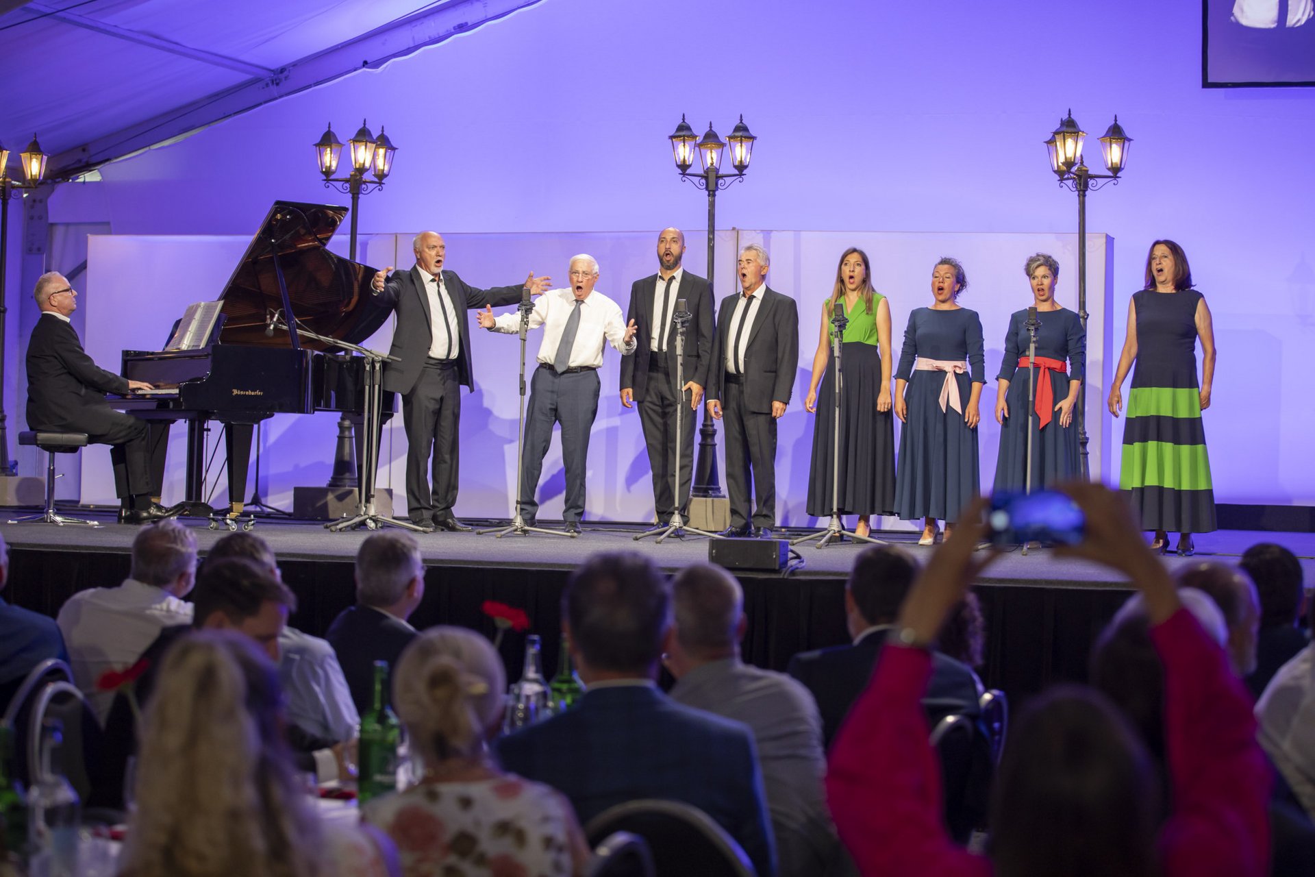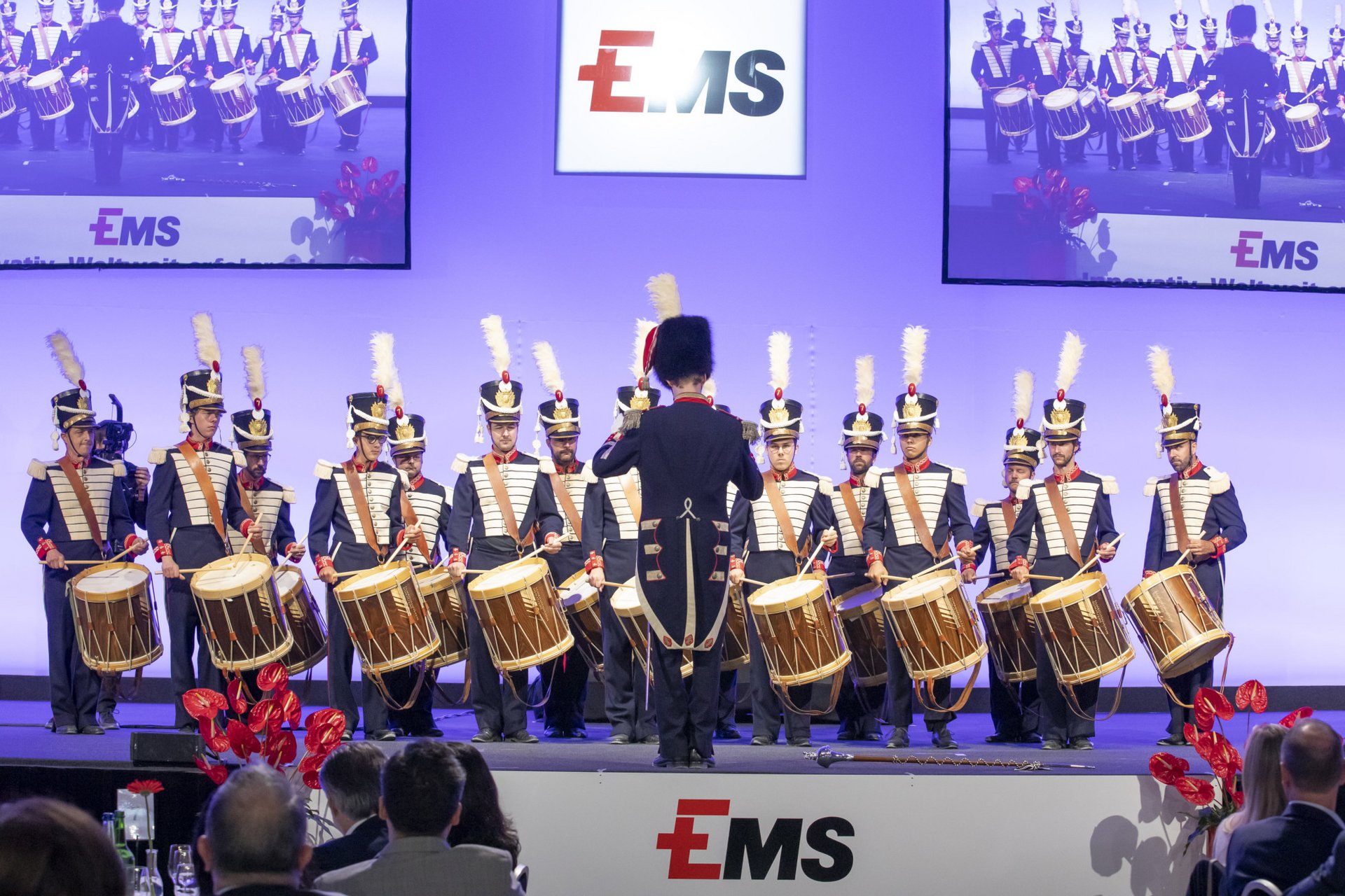 Das stimmgewaltige Gesangsensemble La Compagnia Rossini unter der Leitung von Armin Caduff begeisterte die Generalversammlung mit fröhlichen und melodischen romanischen Volksliedern. Für die Zugabe riefen sie den EMS-Ehrenpatron und Altbundesrat Dr. Christoph Blocher auf die Bühne, welcher das Ensemble gesanglich zusätzlich verstärkte. Den Schlusspunkt des reichhaltigen Programms der Generalversammlung setzte traditionsgemäss der Tambourenverein Domat/Ems in historischen Uniformen unter der Leitung von Tambourenmayor Leandro Spescha.