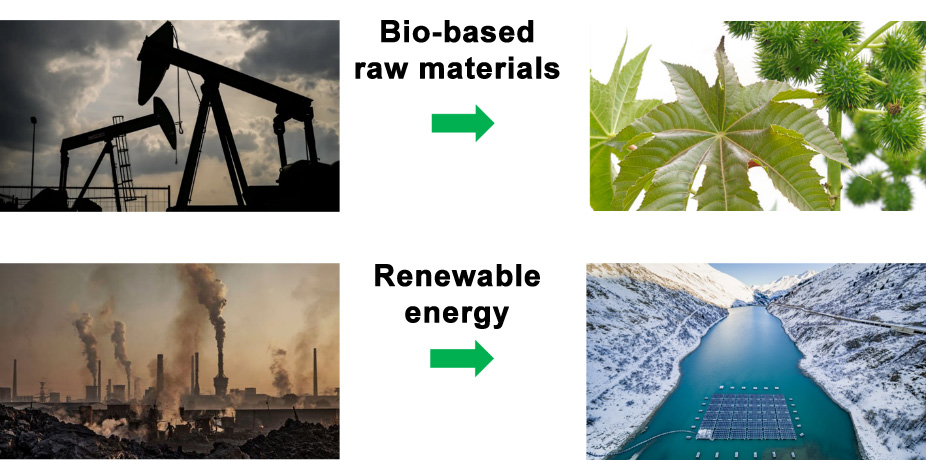 EMS relies on innovative technologies and sustainable processes to continuously increase the share of sustainable material in its products. This can be done in several ways: Use of bio-based raw materials, use of raw materials produced with sustainable energy and with recyclate from chemical and mechanical recycling. (Fig. 3: Options for the production of sustainable products)