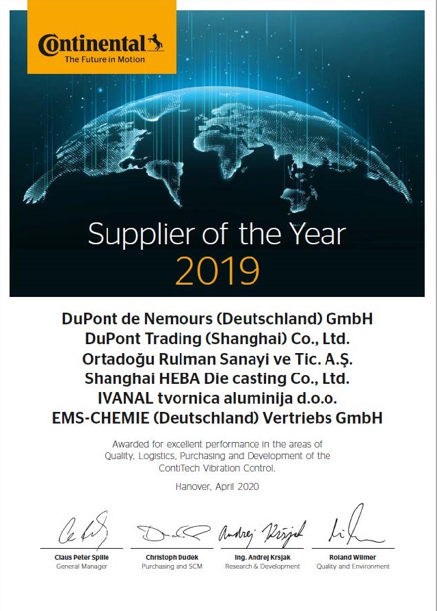 EMS-CHEMIE AG was honored with the "Supplier of the Year 2019" award by Continental. Thanks to the successful partnership and innovative solutions in light-weight design and cost-reduction, EMS has proven itself against 160 competitors.