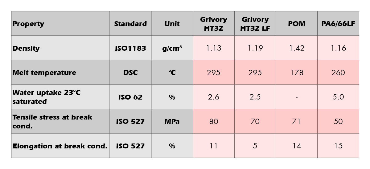 The basic version Grivory HT3Z is characterised by high strength and toughness while in addition, both Grivory HT3Z and Grivory HT3Z LF exhibit very low water uptake, high dimensional stability and excellent resistance to chemicals. With this exceptionally good property profile, Grivory HT3Z and Grivory HT3Z LF open up new fields of application – starting at the point when conventional materials such as POM, PA6 or PA66 reach their limits or are well beyond them.